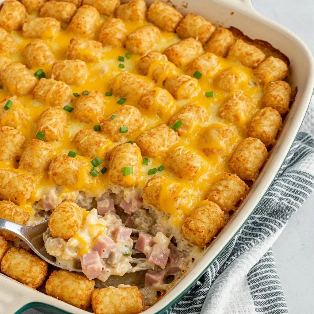 This isn’t just a casserole; it’s a culinary revelation that takes a tired, over‑cooked staple and elevates it into something that feels both nostalgic and brand new. The secret lies in the layered approach: I start with a sauté of onions and garlic to build a flavor base, then fold in the ham and tater tots, followed by a silky sauce made from milk, chicken broth, and a touch of Dijon mustard that adds depth without overpowering. The cheeses are carefully chosen—cheddar for sharpness, mozzarella for stretch, and parmesan for a nutty finish—creating a melty, golden top that’s impossible to resist. A breadcrumb and butter crust crowns the casserole, giving it a crisp, buttery finish that’s the final flourish. The result is a dish that feels indulgent, yet surprisingly light, and it’s the kind of comfort food that people will rave about for weeks.